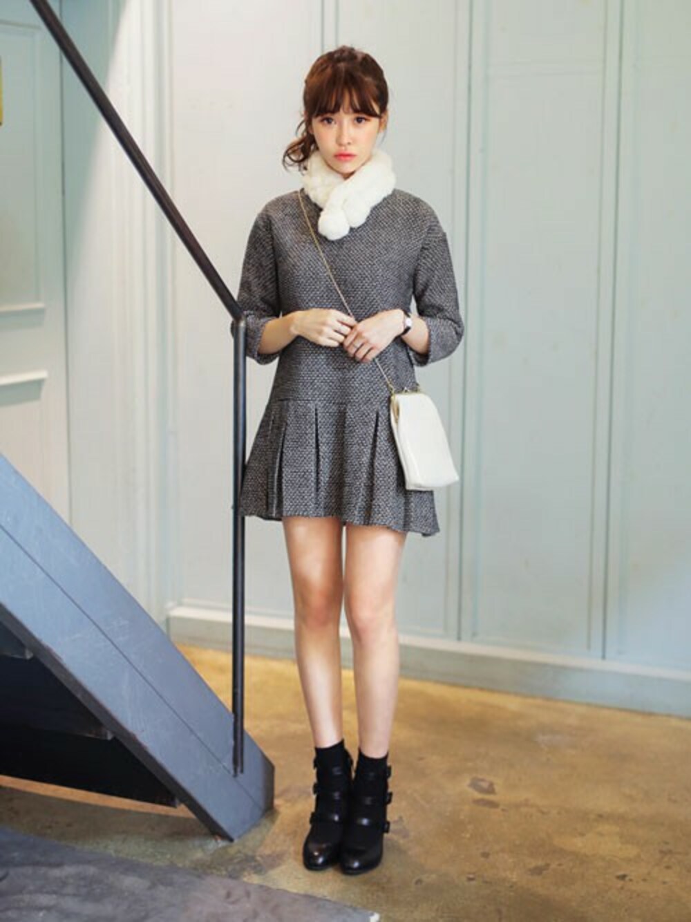 かっちり素材のプリーツミニワンピースでいいこちゃんコーデ! お呼ばれやデートにもおすすめです♡ 全体のトーンを合わせたことで、よりホワイト小物が引き立っています。 メリージェーンのヒールシューズを合わせて、子供っぽくなりすぎない&脚長見え!