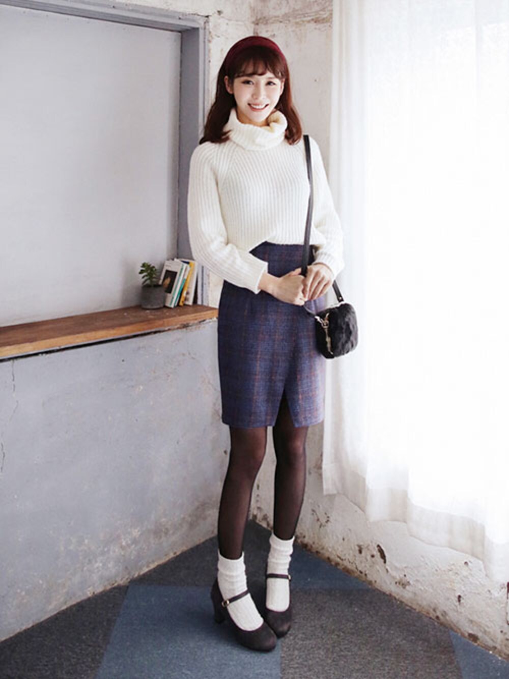 ★☆メリークリスマス☆★ ラグランスリーブのあたたかく着やすいニットをスリットが入ったウール混紡のチェック柄スカートにインして、ラップデザインをしっかりアピール♪ ニットヘアバンドでカジュアルダウン★