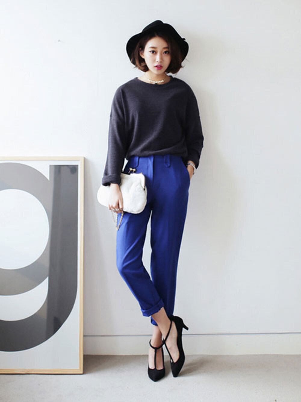 ブラック×ブルーの大人リラックス感のある2トーンのコーディネート。シンプルな組み合わせのコーデは、小物使いがポイント!ストラップシューズとハットの存在感でおしゃれ度がアップします★