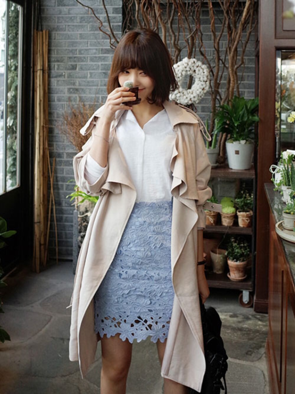 先日ご紹介した白レースのスカートのブルーカラーを着用したコーデ! 淡いブルーがきれいでエレガントな印象★ シンプルなシャツをあわせればオフィスもOKなきれいめスタイルの完成です♡♡