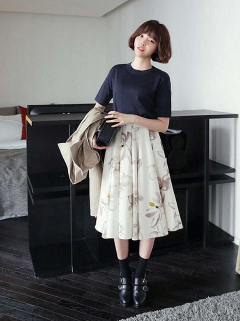 プレーンなTシャツにひざ丈スカートの王道てっぱんコーデですが、 さわやかな花柄を選んでトレンド感をプラス★ ふんわり広がるAラインのフレアスカートで、気持ちもふわっ・・・ ちょっと変わったデザインのヒールで、足元インパクト!