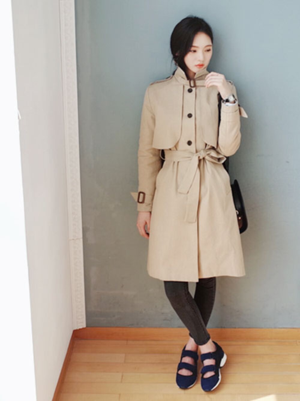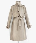 注文殺到のシングルボタンのコートは、襟ベルトをしめ、ウエストリボンを結んだスタイリングがおすすめ。足元はベルクロスニーカーではずして♪