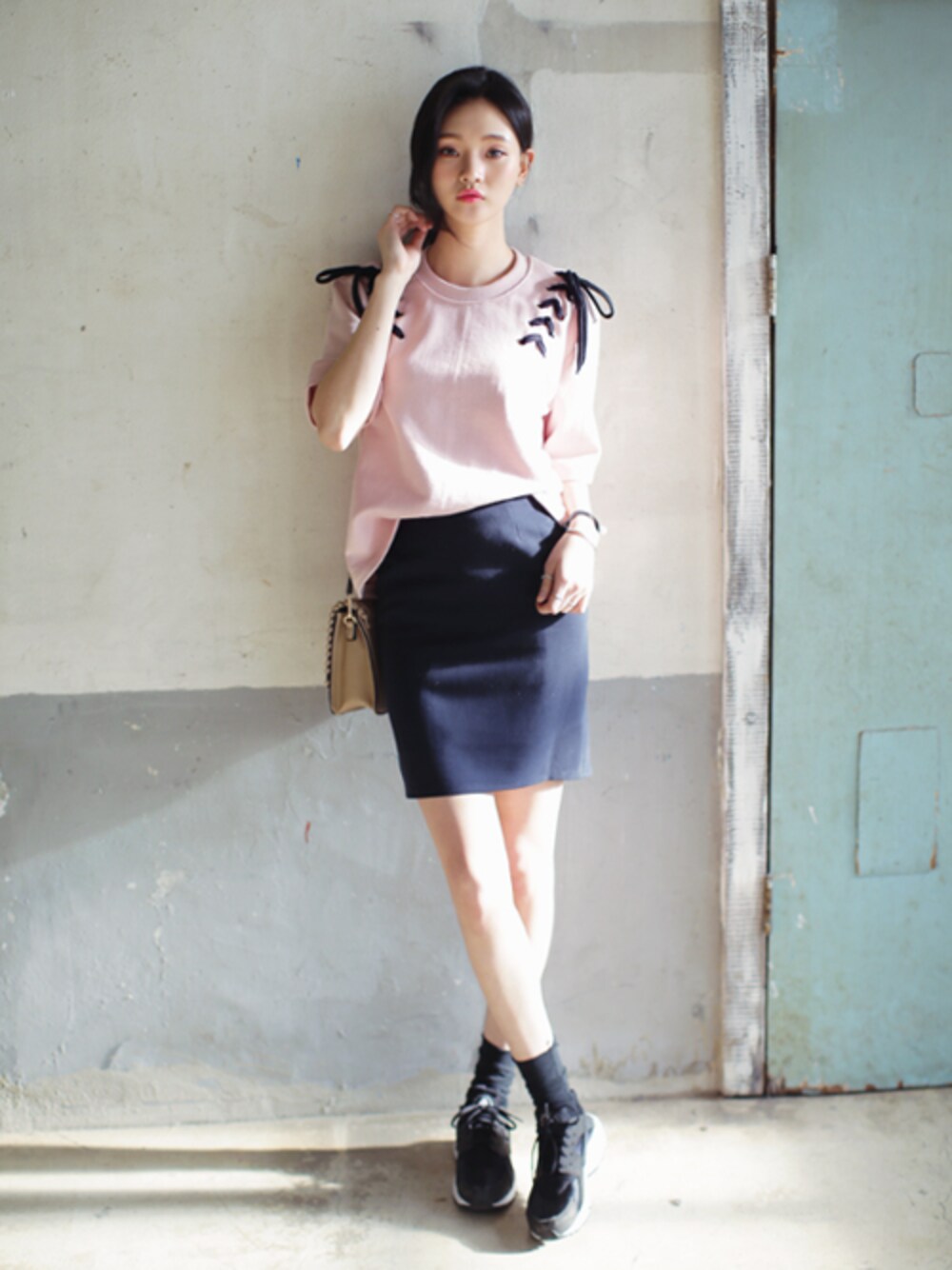 スウェットのTシャツは 珍しいレースアップのデザインがポイント! 上が少しゆったりしているので、 ボトムスはタイトにきめてスッキリさせました。 カジュアルにスニーカーで仕上げましたが 暖かくなったら、サンダルを合わせても かわいいです♡