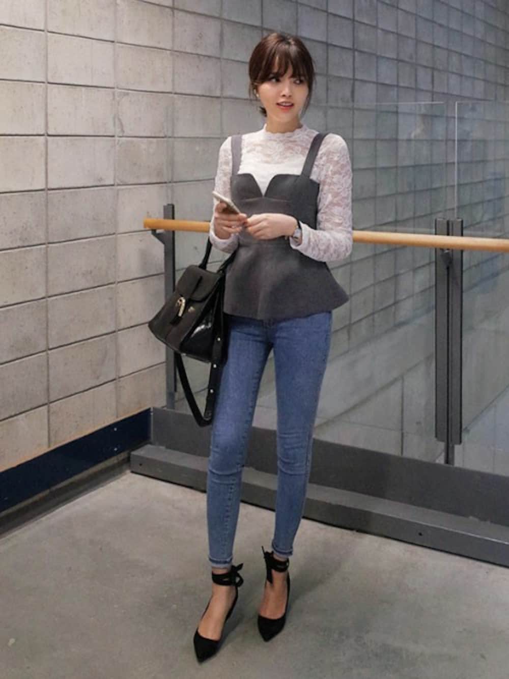 透け感がありSEXYめなレースのトップスに ペプラムデザインのビスチェをレイヤード♡ スキニーデニムを合わせることで ペプラムに+αでさらに美脚&脚長効果! 足首リボンがポイントのパンプスで、 足元まで女性らしさを意識しました。