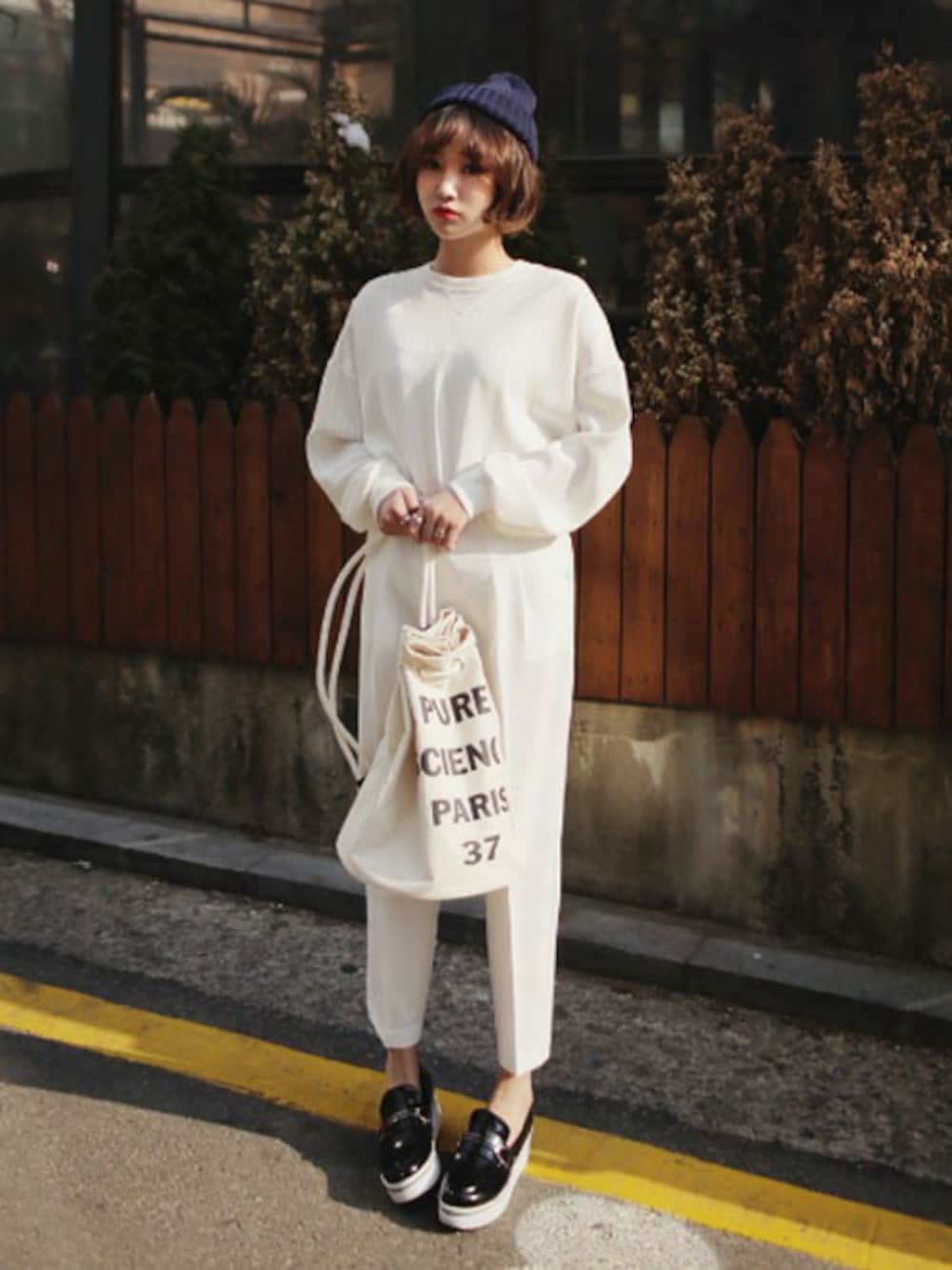 トレンドのオールホワイトに挑戦! バッグまでホワイトでこだわりました。 ニットキャップはリボンのモチーフつきで、 甘くなりすぎないように モチーフがあえて後ろにくるようにかぶりました。 トップスをインすると、オールホワイトでも すっきりして逆に脚長効果があり スタイリッシュに仕上がります!