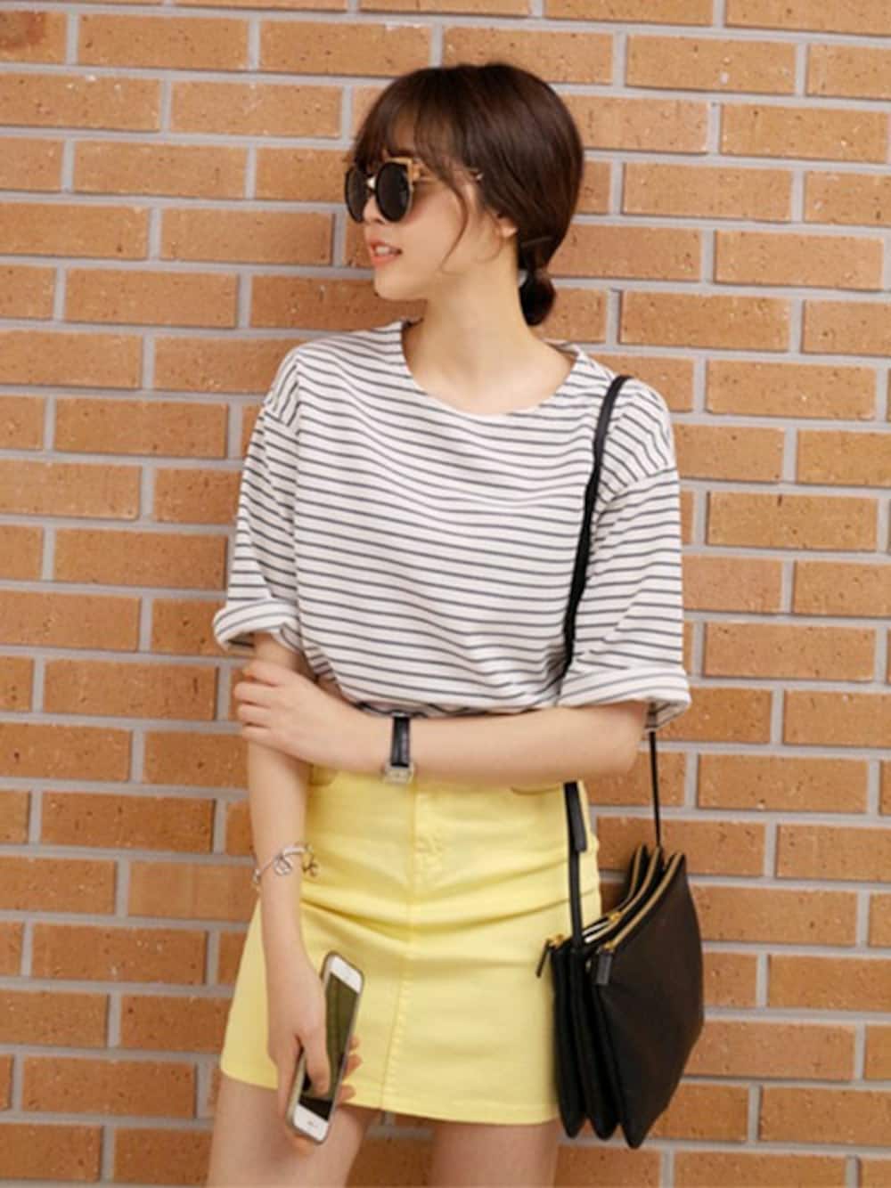 春夏トレンドカラーのイエローがぱっと目をひくスカートにルーズフィットなボーダートップスをあわせたカジュアルスタイル。 一見シンプルなコーデも、大ぶりアクセでぱっと華やかでこなれた印象に。 着用の「love」モチーフのタイポグラフィバングルは注文殺到中です!! ☆DHOLICの新作は24時間限定で10%OFF☆