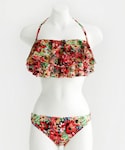 ☆水彩フラワー柄ティアードバンドゥビキニ ¥5,500+消費税 ビビッドカラーの爽やかなフリルビキニです! ティーアードデザインで、バストにボリューム感をもたせることができます◎ かわいい水彩のフラワー柄でビーチで目立てちゃいますよ♡