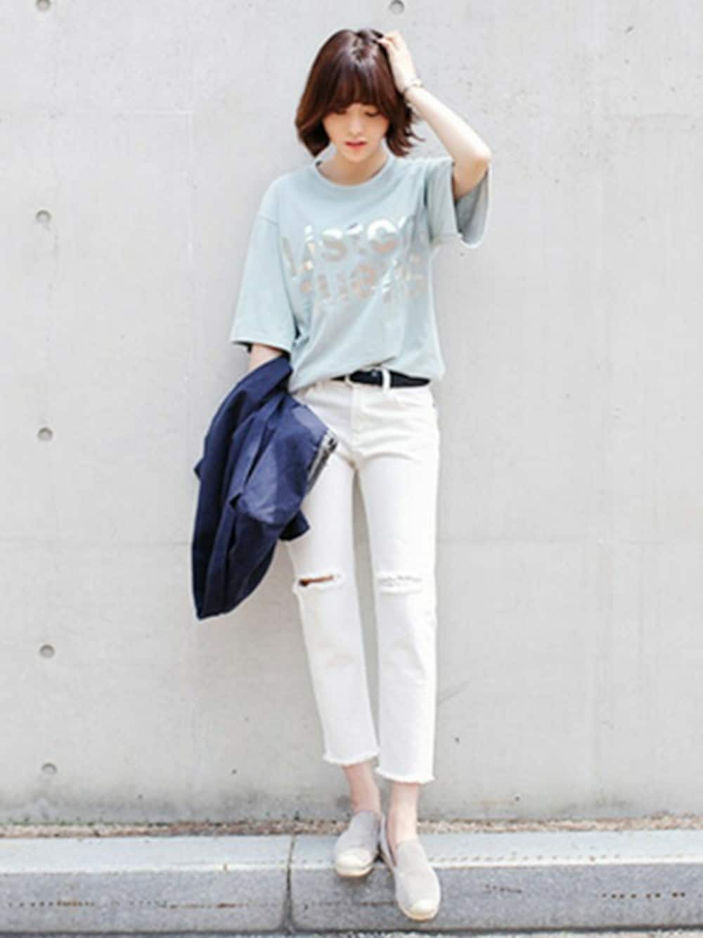 メタリックのロゴが際立つさわやかな淡いブルーのTシャツに、ダメージ白パンツをあわせたコーディネート。 お気に入りのTシャツはシンプルに着こなして、コーデの主役に♡ ☆DHOLICの新作は24時間限定で10%OFF☆