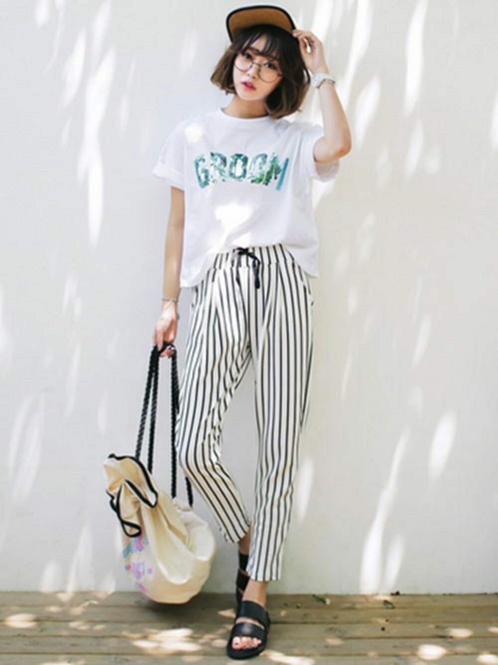 ストライプ柄のパンツは伸縮性ありで履き心地ばっちり! ロゴT&キャップをかぶった、夏のカジュアルコーデです★ ☆DHOLICの新作は24時間限定で10%OFF☆