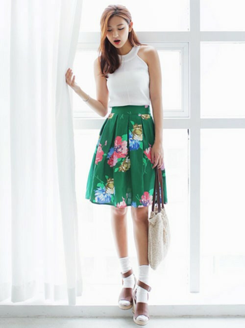 夏に着る花柄は鮮やかカラー&大柄が気分です♪ かごバッグ&ウエッジサンダルで、夏らしさもアップ!! トップスは思い切った肌見せで大人っぽさもしっかり☆ ☆DHOLICの新作は24時間限定で10%OFF☆