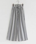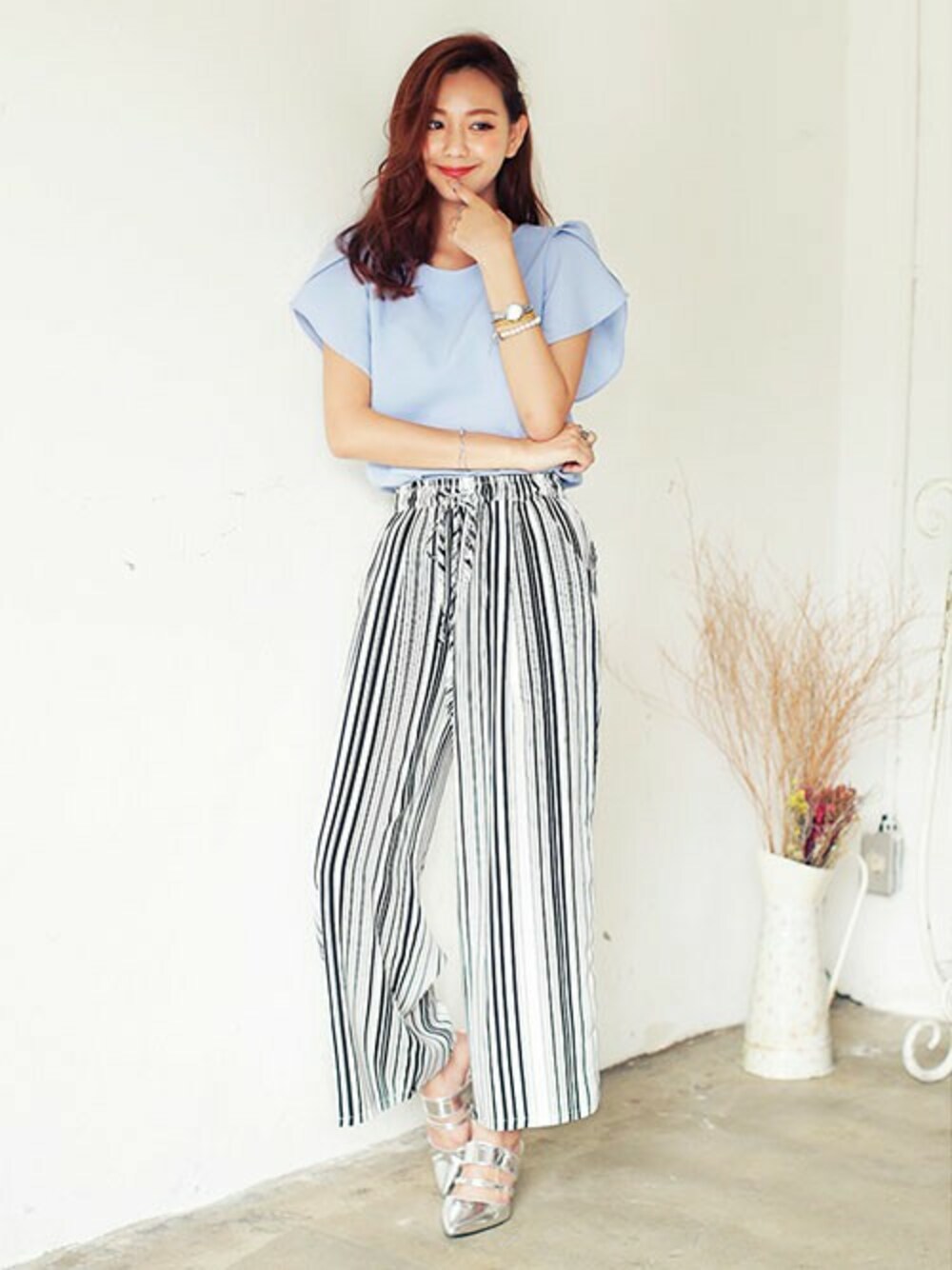 COOLなストライプ柄パンツ×フェミニンTOPSをあわせた、フレッシュなテイストミックスコーデ☺♥ ブルーカラーをチョイスでバランスよくまとまります♪ 足もとのシルバーがアクセントに!◎ ☆DHOLICの新作は24時間限定で10%OFF☆
