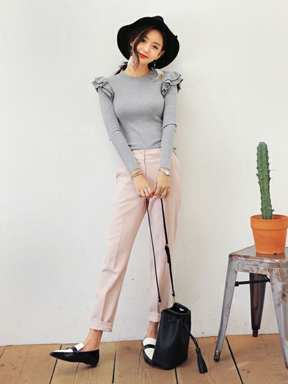 ボリューミーなフリルがポイントのグレートップスと淡いピンクのスラックスの 冬のガーリーコーディネート♡ センタープレスのかっちりスラックスもフリルトップスと合わせて女の子らしさをプラス♪ 小物を黒で統一すれば甘くなりすぎません!! ☆DHOLICの新作は24時間限定で10%OFF☆ :::::::::::::: DHOLIC's Instagram account ↓↓↓ dholic_official ::::::::::::::