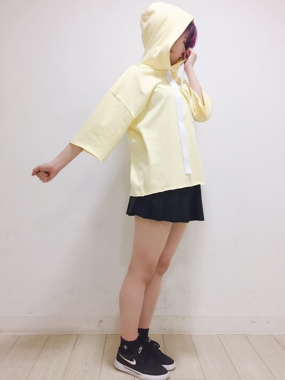 カットパーカー color:yellow/red/black size:free プリーツミニスカート color:white/black size:free ビッグシルエットのトップスは 華奢見せできる優秀アイテム♪ スカートのチラ見せもポイントです✴︎