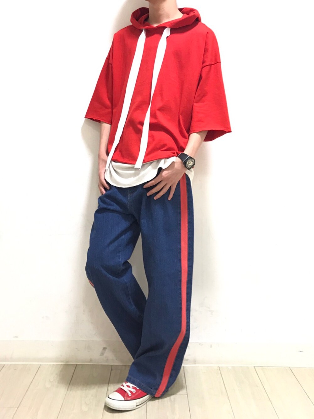 カットパーカー color:yellow/red/black size:free サイドラインボーイズデニムパンツ color:light indigo/indigo size:S/M トレンドカラーのレッドを主役にした 今年らしいスタイル♪