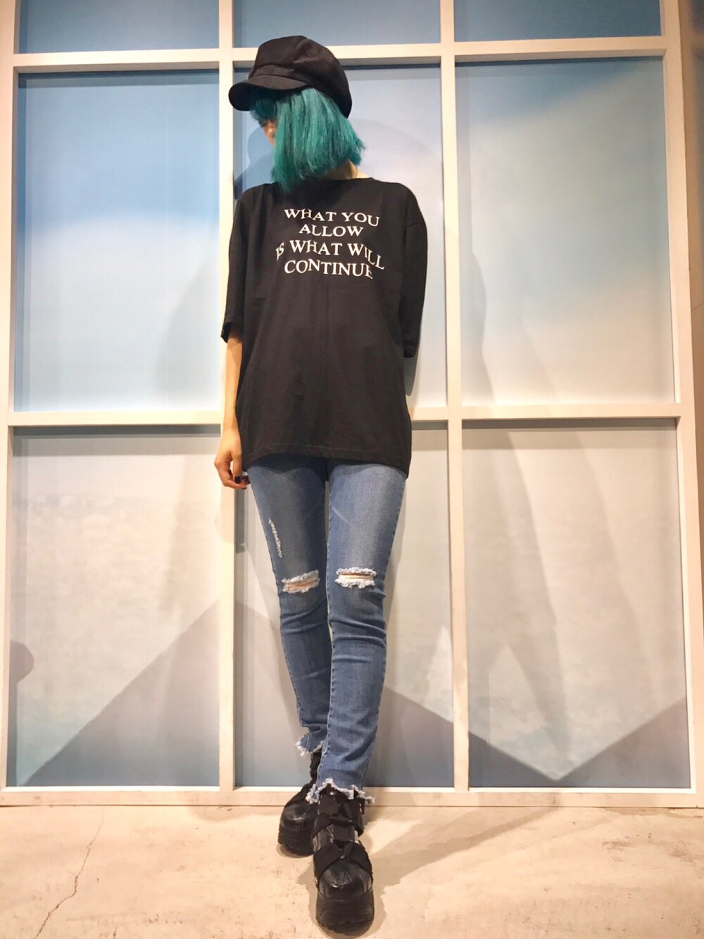 フェイクスウェードキャスケット color:black/white size:free WHAT YOU Tシャツ color:white/pink/black size:free クラッシュスキニーパンツ color:black/indigo/dark indigo size:S/M