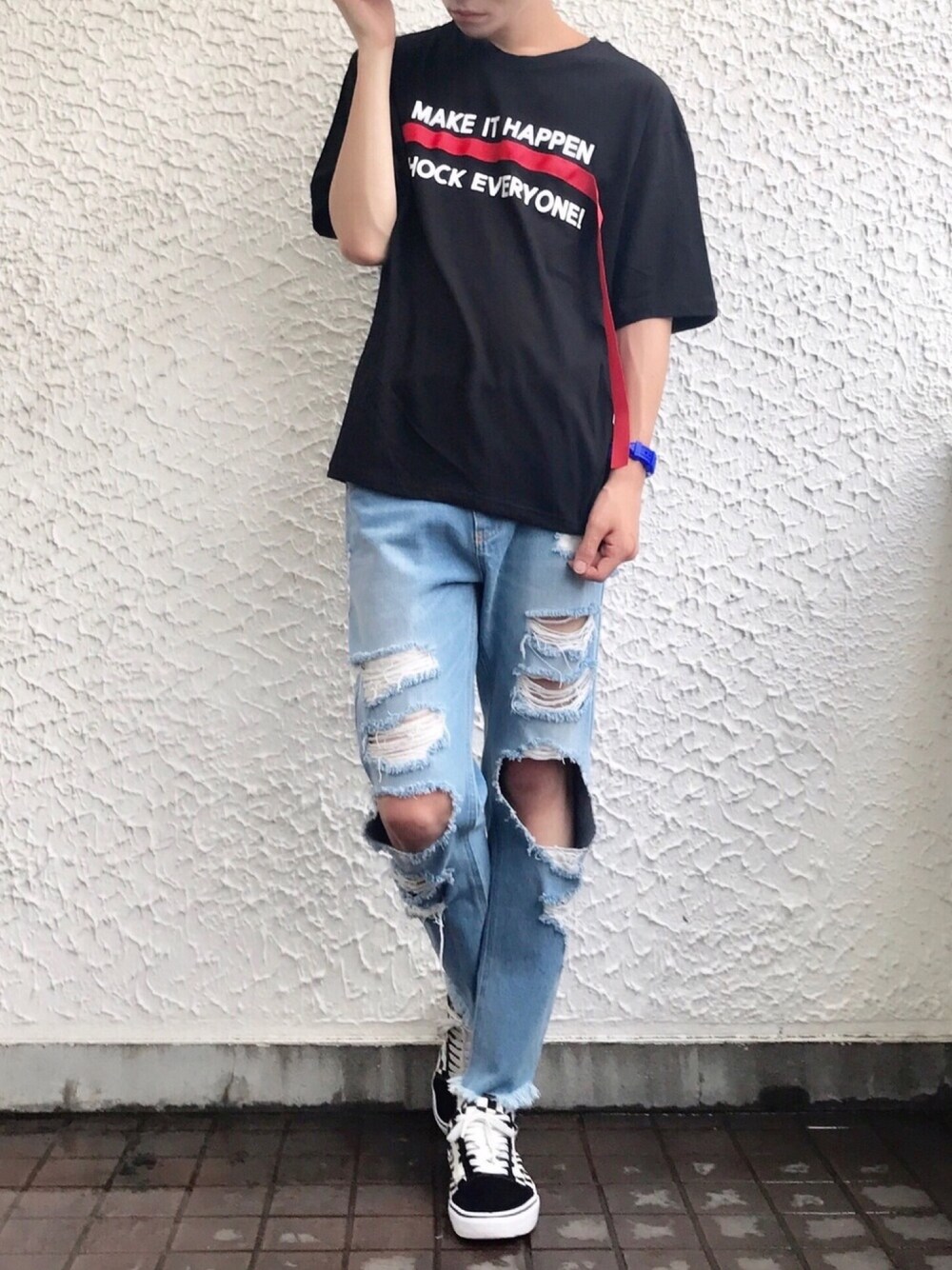 テープ付きメッセージTシャツ color:yellow/white/black size:free デストロイドデニムパンツ color:light indigo/indigo size:S/M