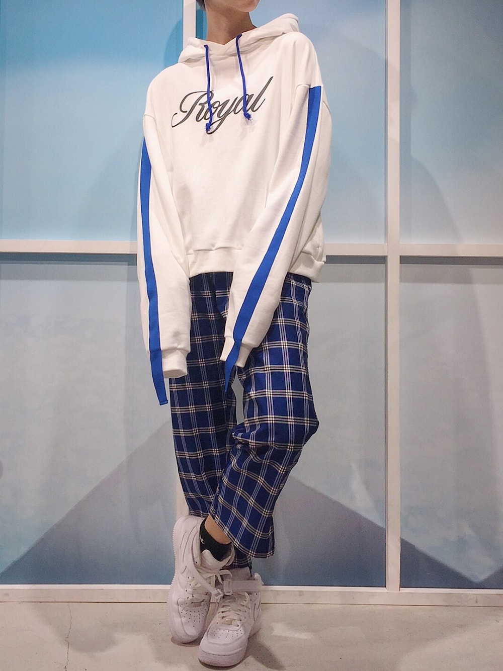ROYALパーカー color:white/black size:S/M スリットチェックスラックス color:blue/black size:S/M
