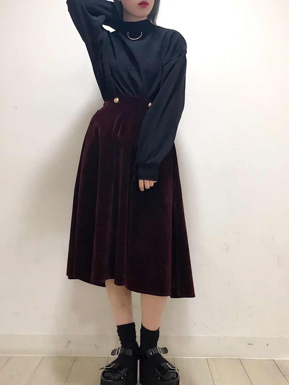 Dリング付きプルオーバー color:brown/mustard/black size:free ベロアミドルスカート color:wine/dark Green/black size:free