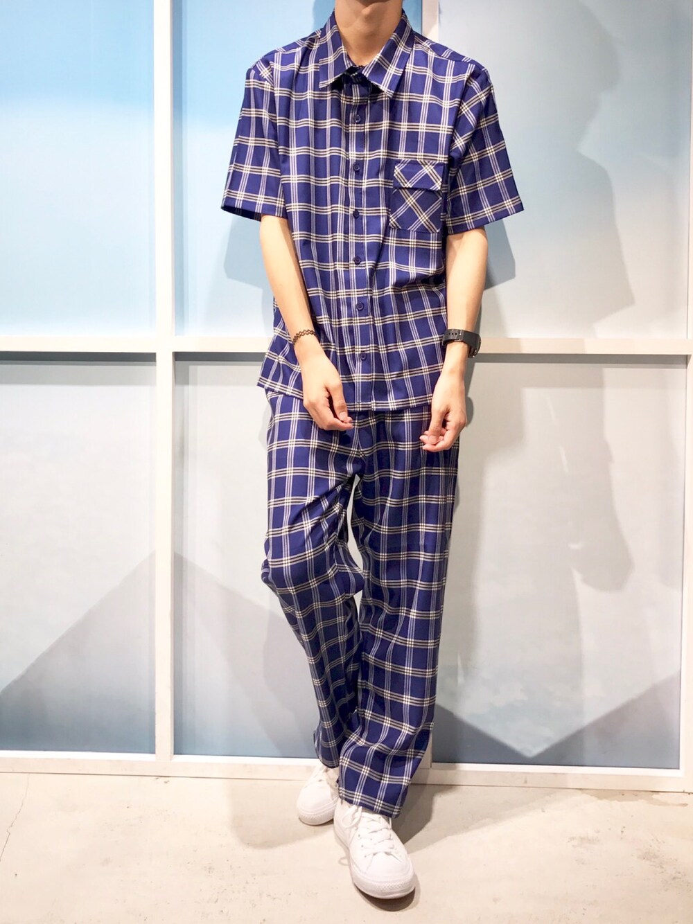 半袖チェックシャツ color:blue/black size:S/M スリットチェックスラックス color:blue/black size:S/M