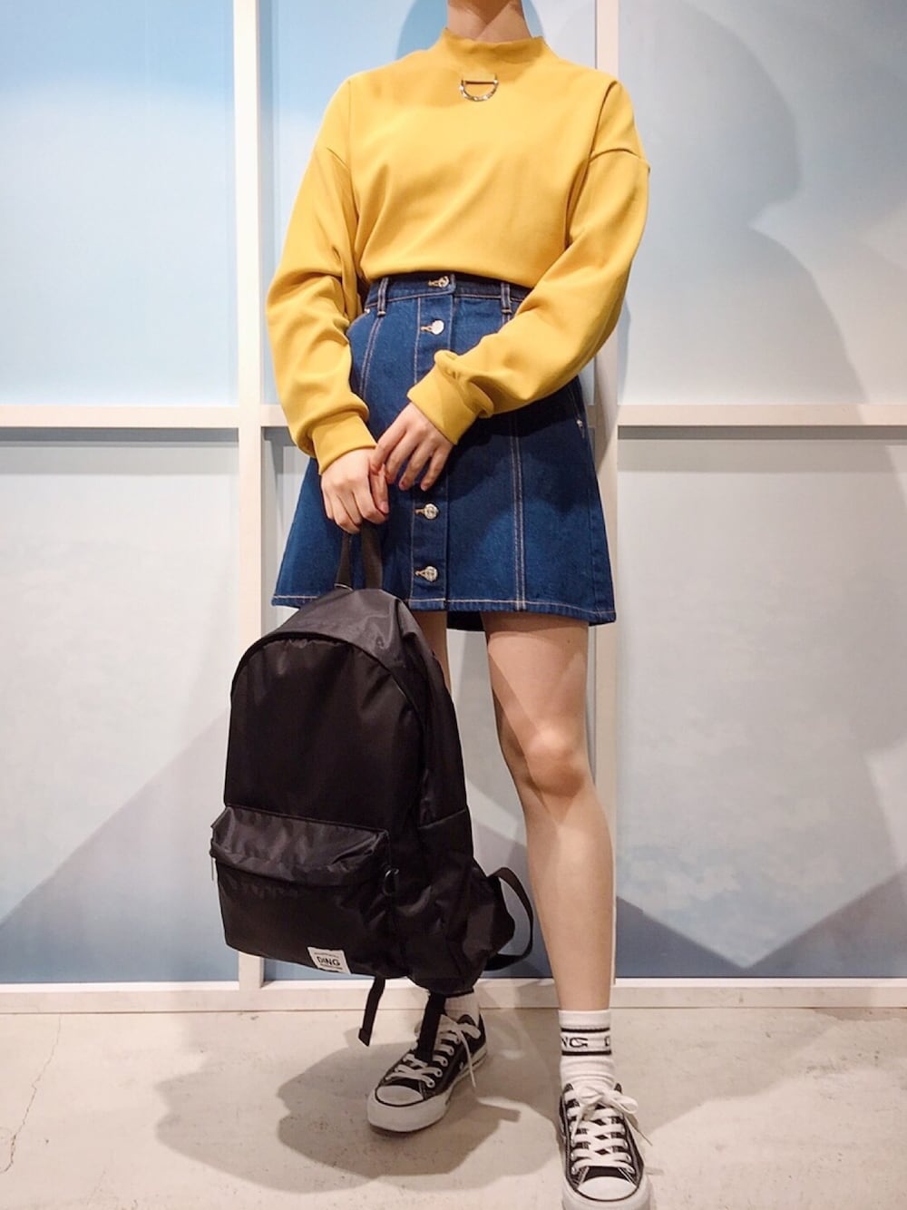 Dリング付きプルオーバー color:mustard/brown/black size:free 前ボタンデニムスカート color:indigo/black size:free ナイロンリュック color:orange/blue/black size:free