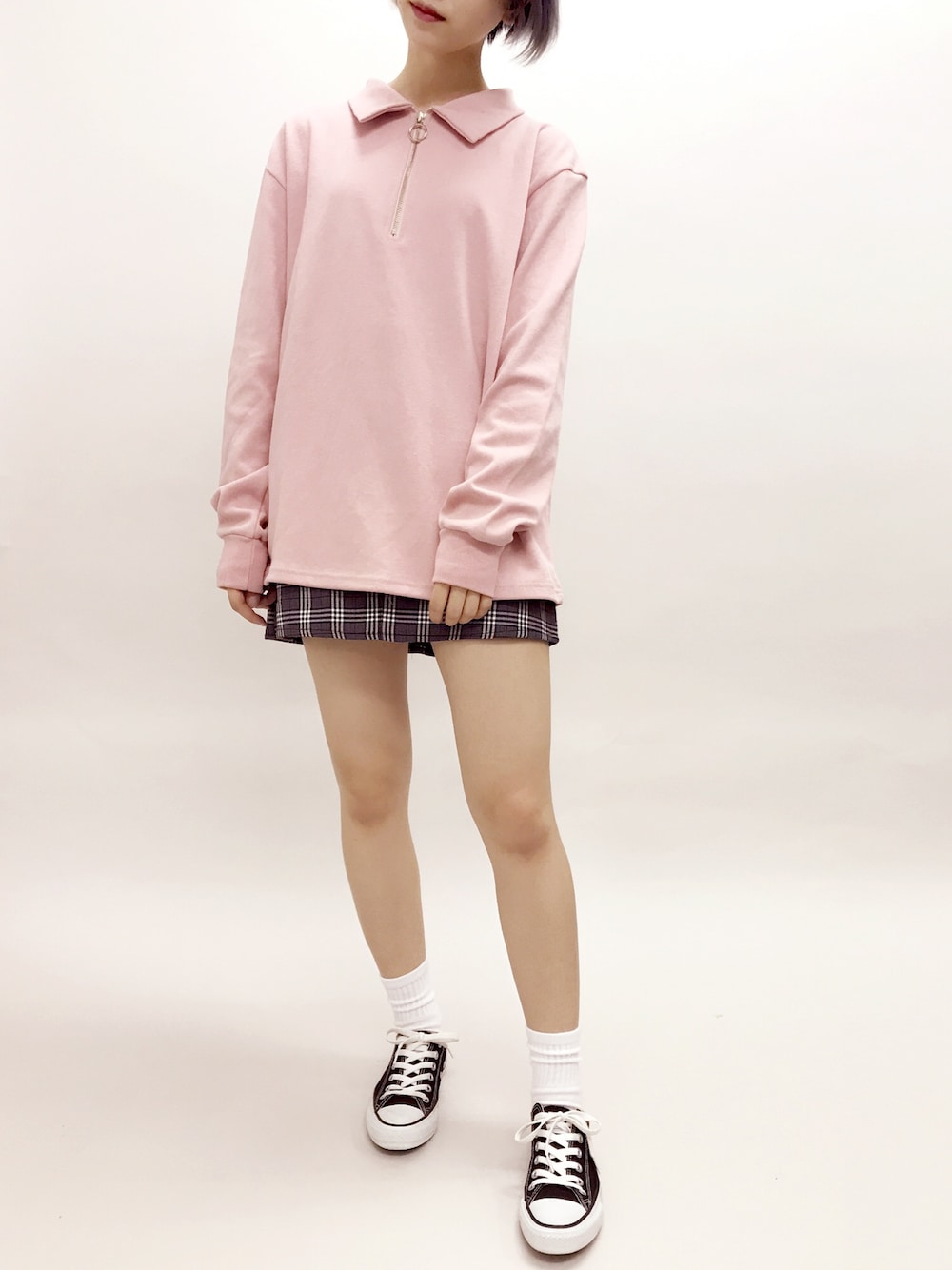 襟付きZIPプルオーバー color:pink/green/black size:free ベルト付きチェックスカート color:gray/light gray size:free