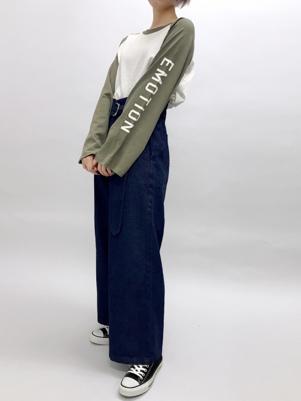 袖ロゴラグランT color:khaki/wine/black size:free ベルト付きワイドパンツ color:light indigo/indigo/black size:S/M