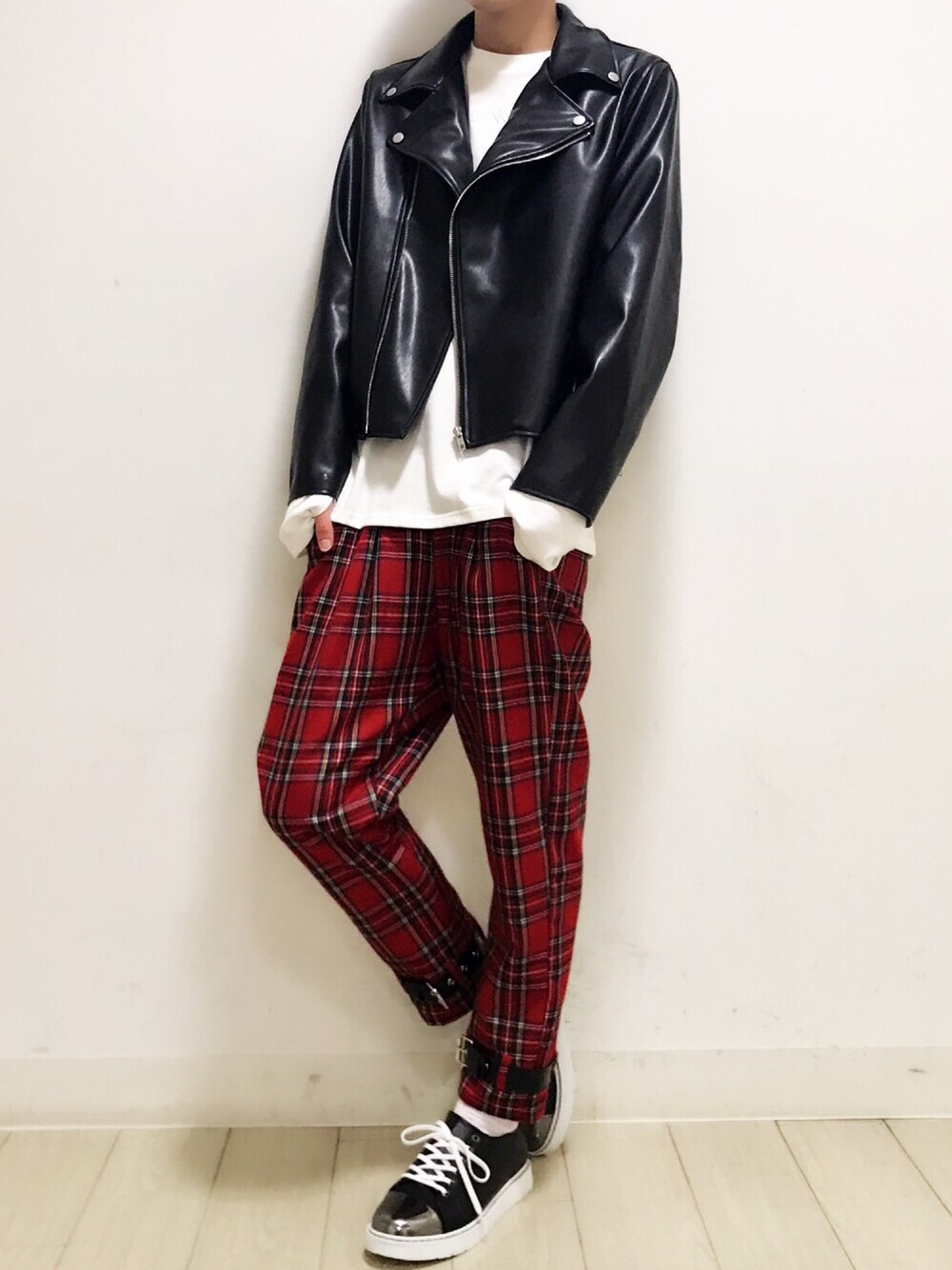ライダースジャケット color:red/black size:S/M ワンポイントロンT color:white/yellow/red/black size:S/M チェック裾ベルトパンツ color:red/black size:S/M