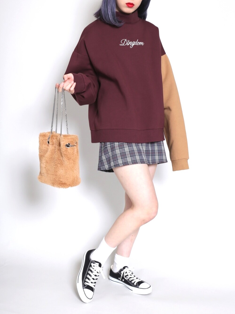 バイカラースウェット color:wine/white/gray size:free ベルト付きチェックスカート color:gray/dark gray size:free フェイクファーチェーンバッグ color:yellow/beige/black size:free