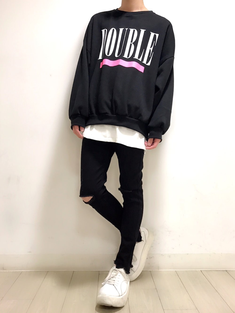 DOUBLEスウェット color:beige/black size:free クラッシュスキニーパンツ color:indigo/black size:S/M