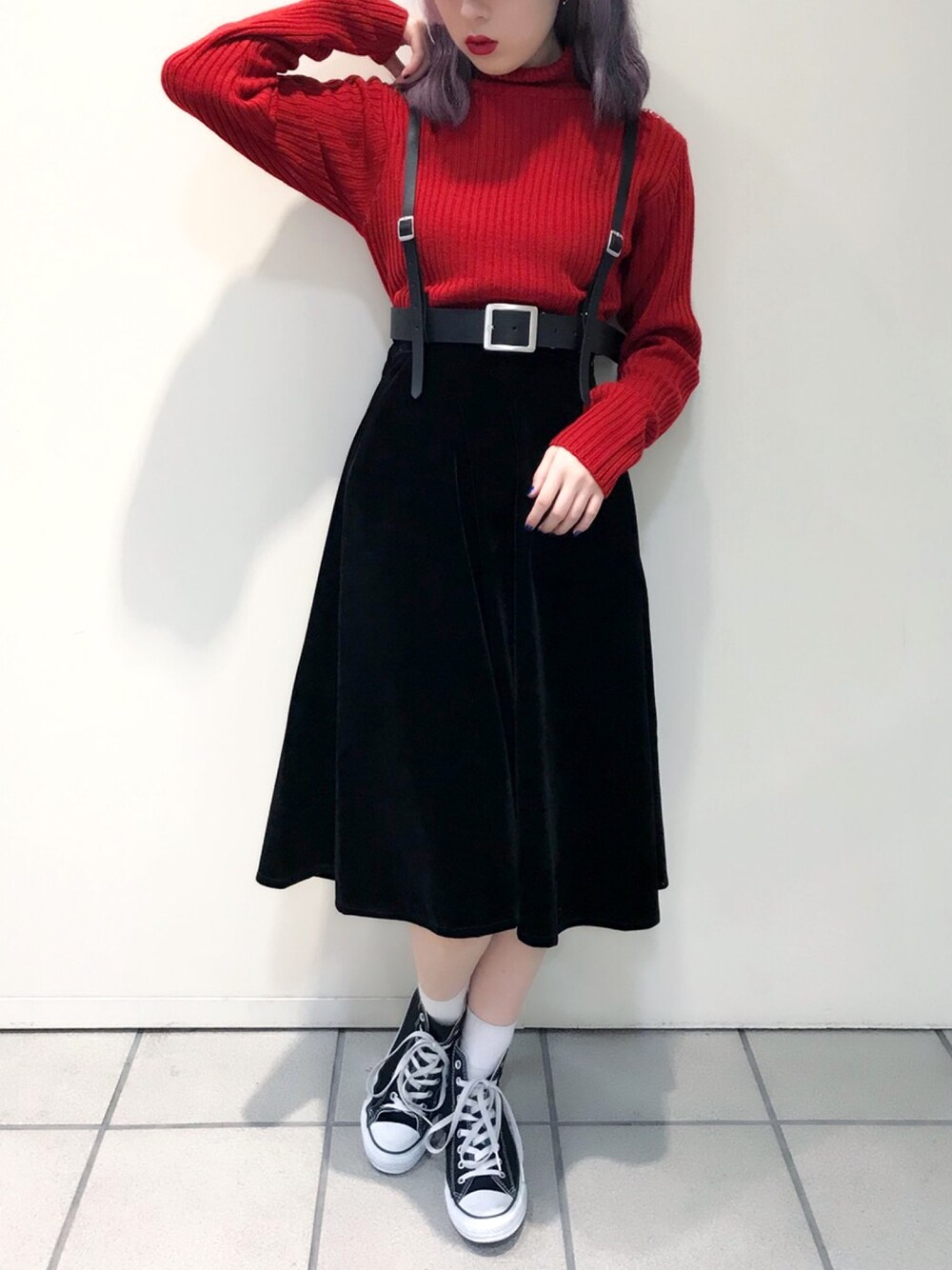 リブタートルニット color:red/silver/black size:S/M ベロアミドルスカート color:wine/dark green/black size:free ハーネスベルト color:brown/black size:free