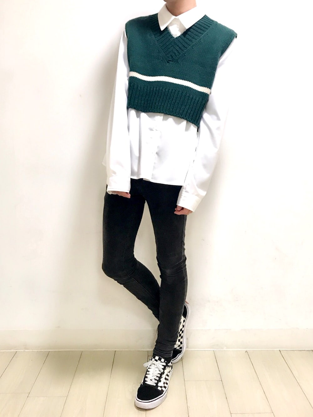 ショートニットベスト color:ivory/green/orange size:free ピクチャーフレームシャツ color:white/black size:S/M スキニーパンツ color:black/indigo size:S/M
