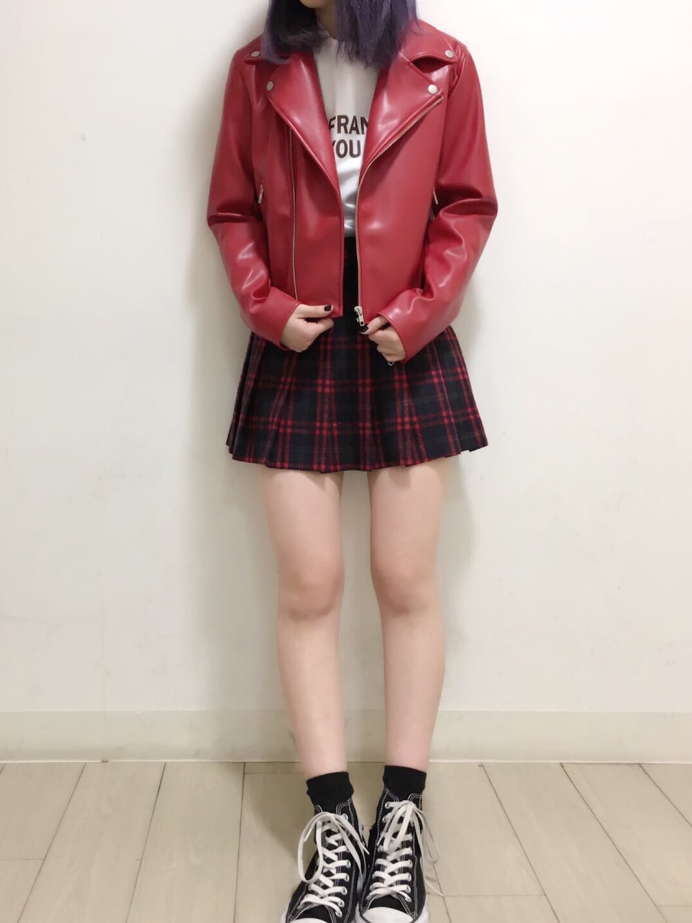 ライダースジャケット color:red/black size:S/M サンフランシスコ7分袖カットソー color:white/pink/green size:free チェックプリーツスカパン color:pink/red/brown size:free
