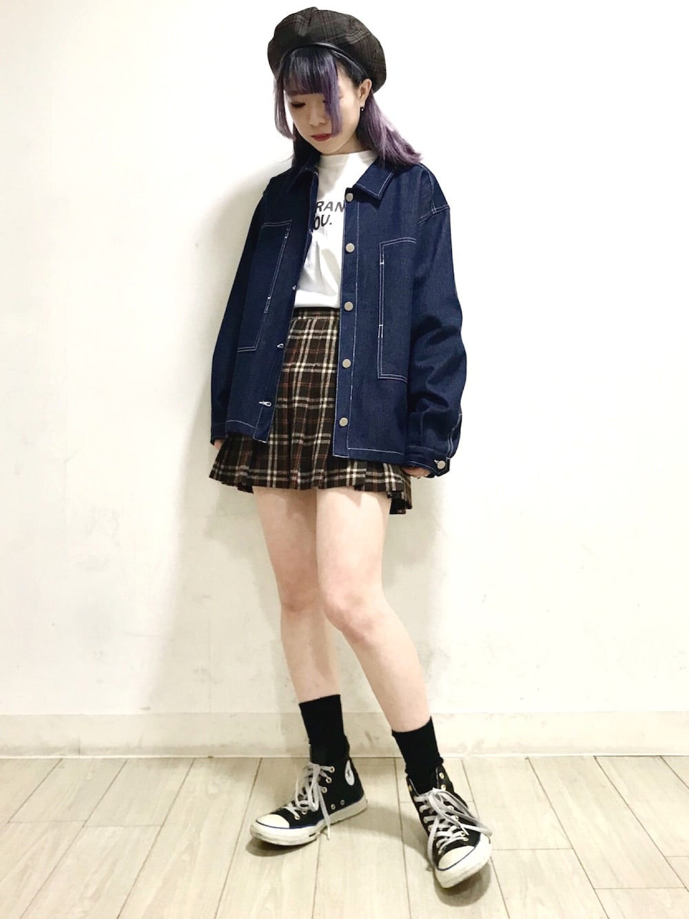 ツイルジャケット color:indigo/mustard size:free サンフランシスコ7分Tシャツ color:white/pink/green size:free チェックプリーツスカパン color:brown/red/pink size:free チェック柄ベレー帽 color:brown/beige/gray size:free