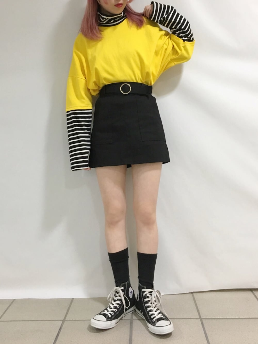 フェイクレイヤードロンT color:yellow/black size:free ベルト付きスカート color:beige/black size:free