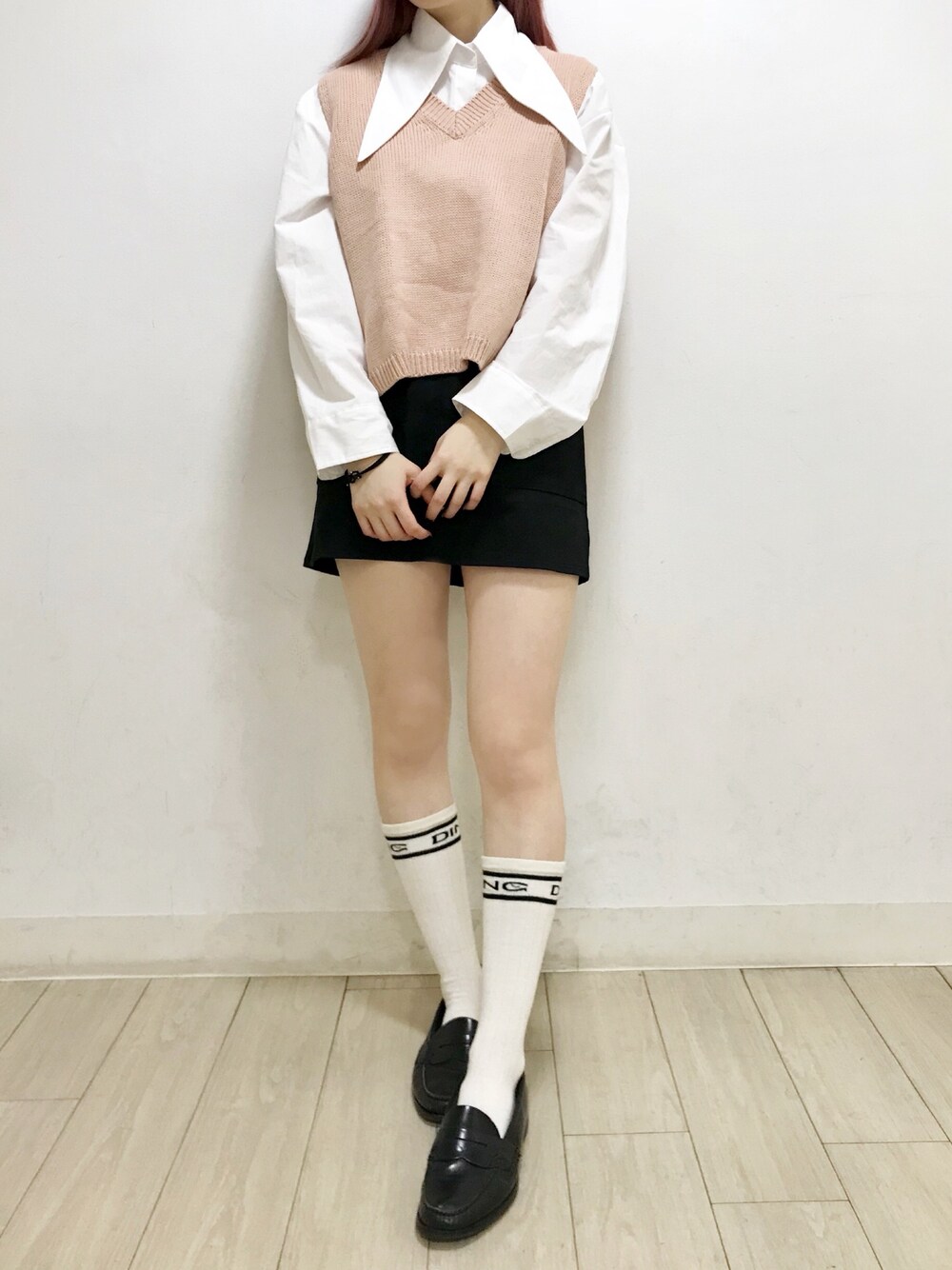 ニットベスト color:pink/white/navy size:free ビッグカラーシャツ color:white/blue size:free ベルト付きスカート color:beige/black size:free