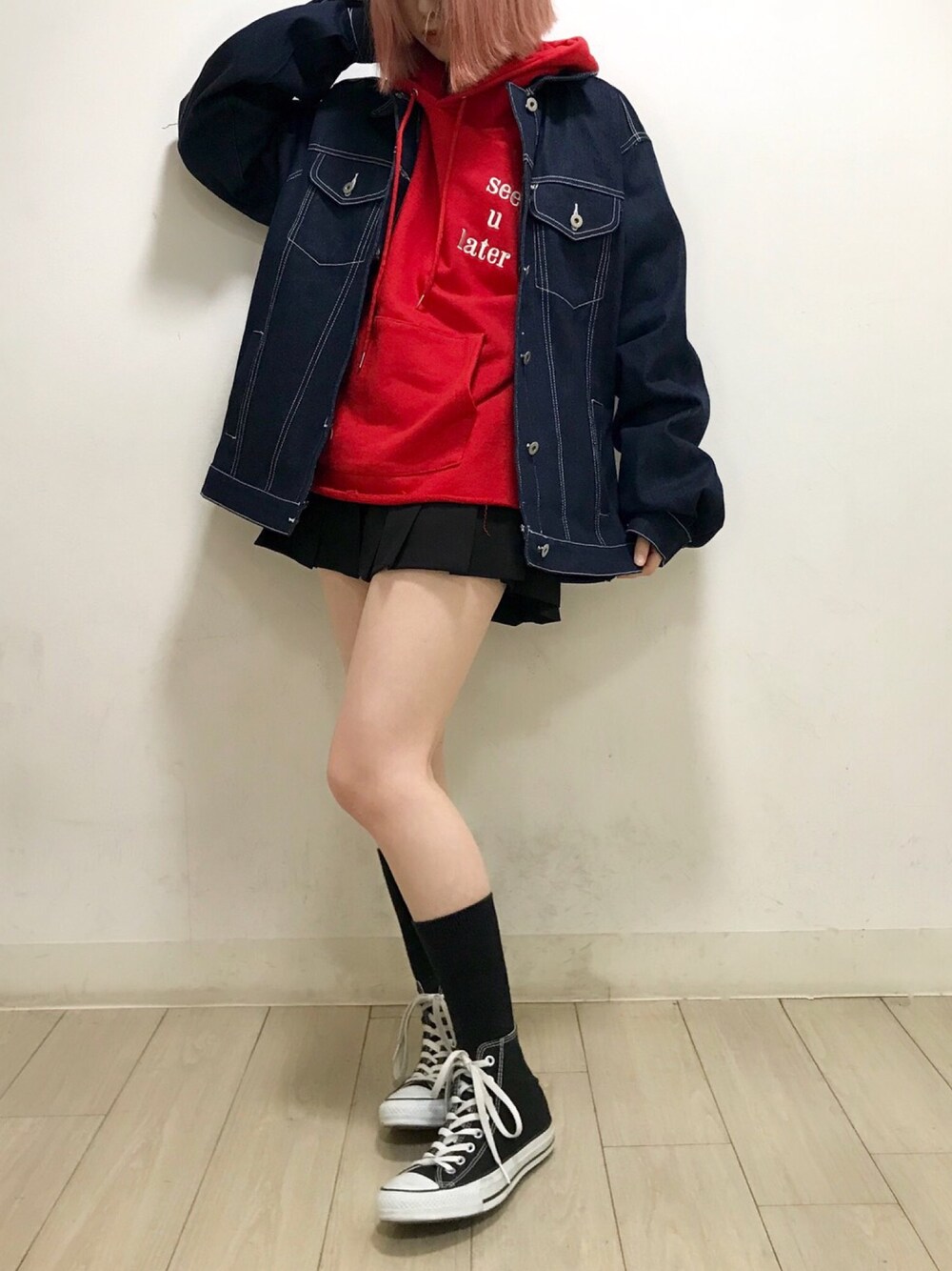 デニムジャケット color:indigo size:free see u laterビッグパーカー color:red/blue/grey size:free プリーツスカパン color:white/black size:free