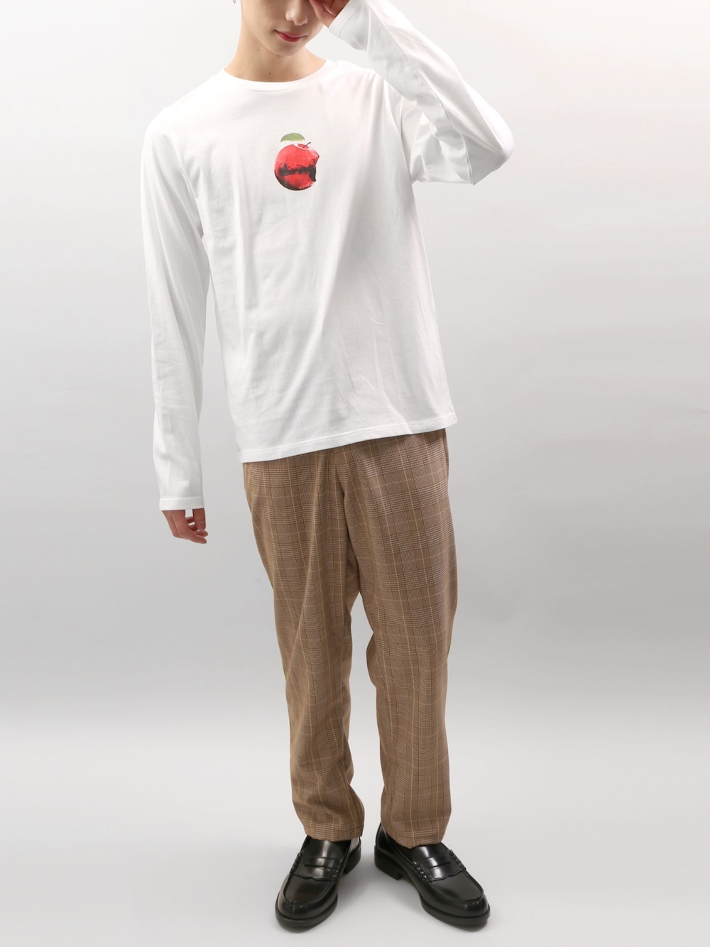 リンゴ火星ロンT color:white/black size:S/M チェック柄パイピングパンツ color:grey/brown size:S/M
