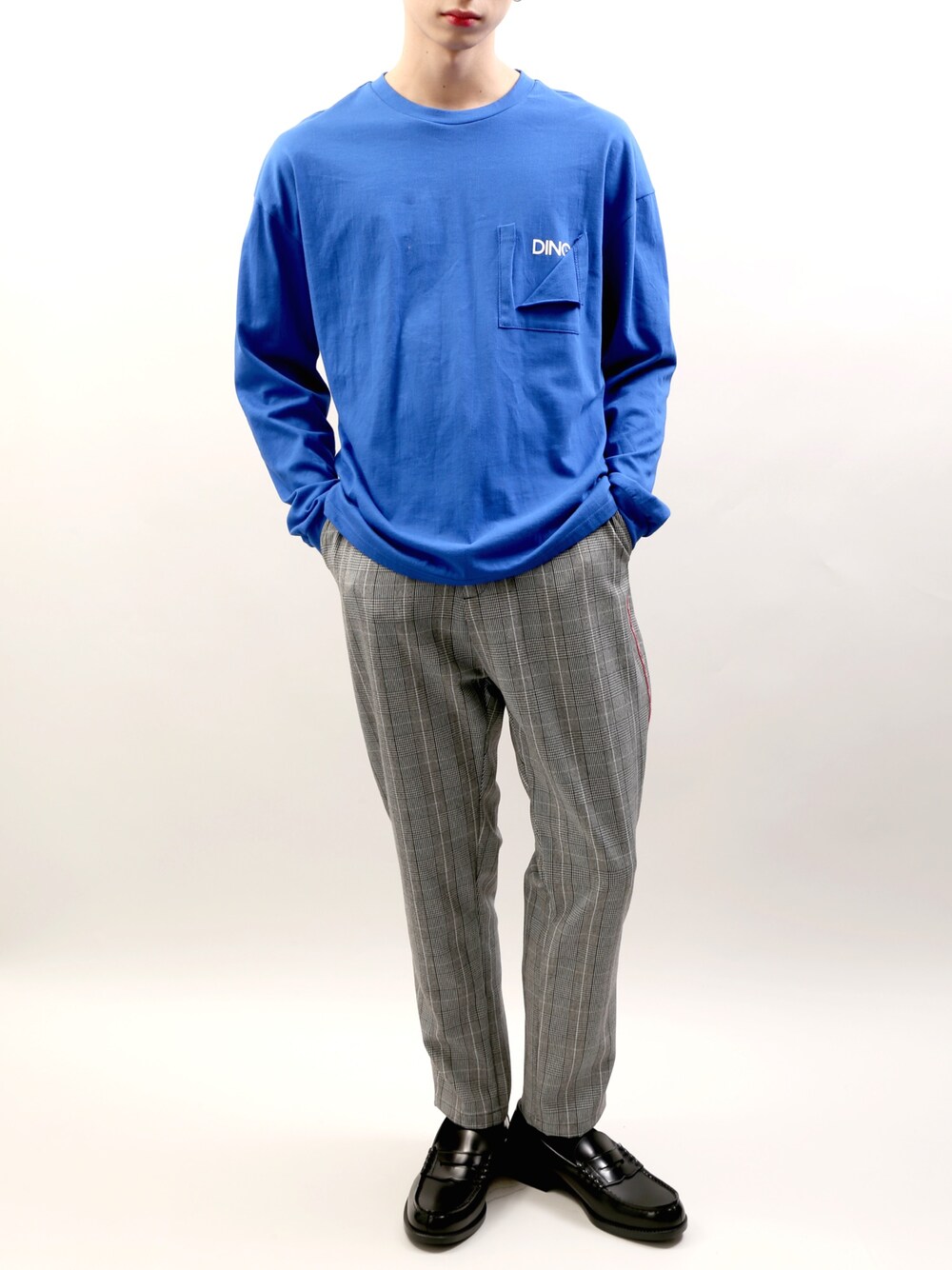 DINGロゴロンT color:white/blue/black size:free チェック柄パイピングパンツ color:grey/brown size:S/M