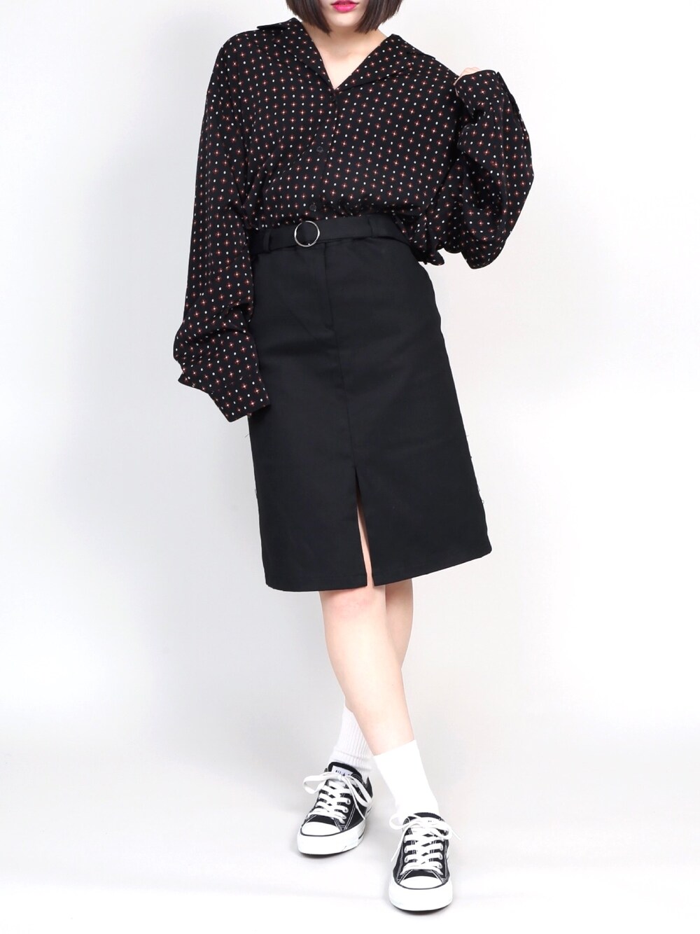 小紋柄開襟シャツ color:brown/black size:free ベルト付きミドルスカート color:black size:free