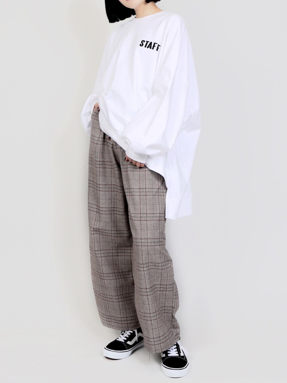 STAFFスウェット color:white/red/black size:free チェック柄イージーパンツ color:grey/brown size:free