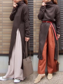 ケーブルチルデンセーター color:white/green/navy size:free ロゴハイネックロングTシャツ color:white/black size:free ワイドパンツ color:beige/black size:free
