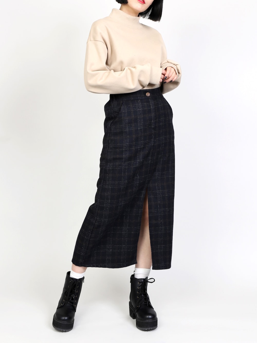 ハイネックスウェット color:beige/blue/brown/black size:free チェック柄タイトロングスカート color:black/brown size:free