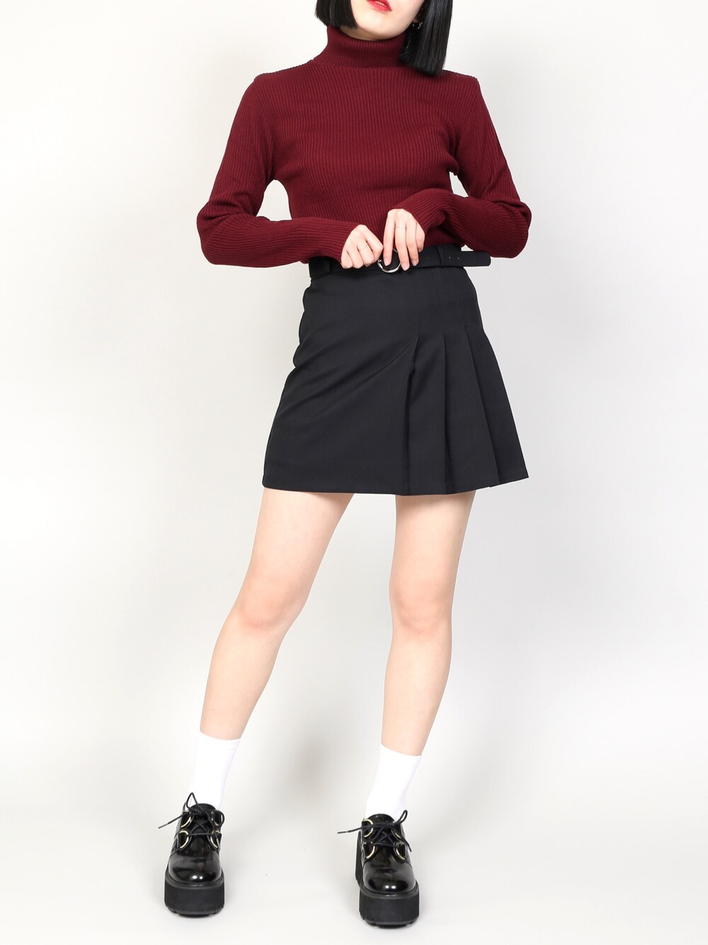 リブタートルネックニット color:wine/yellow/black size:free ベルト付きミニスカパン color:beige/black size:S/M