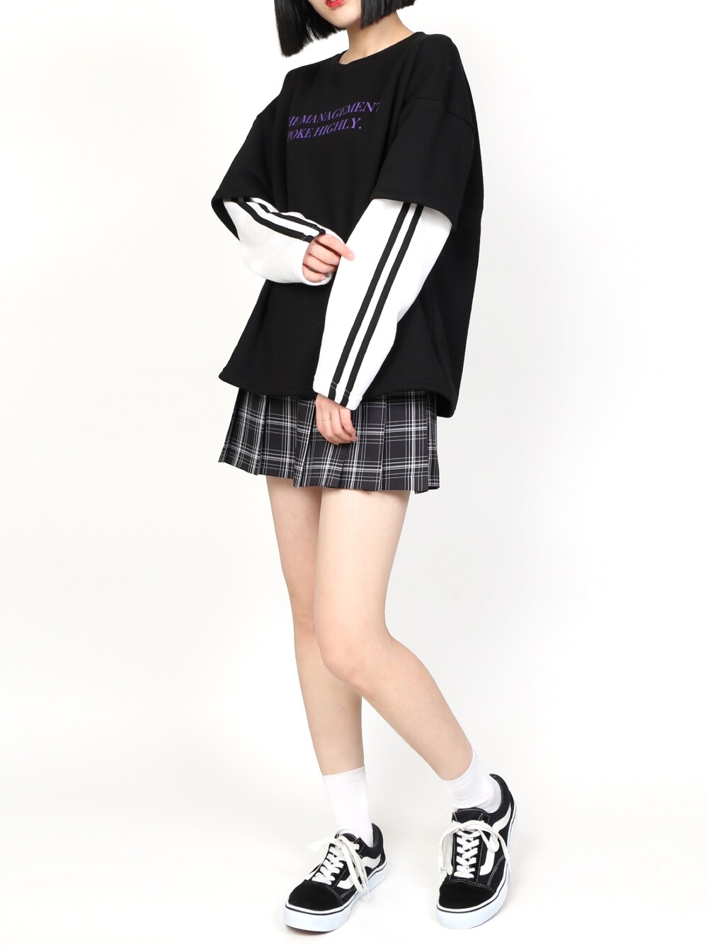 フェイクレイヤードラインスウェット color:yellow/black size:free チェック柄プリーツスカパン color:brown/black size:free