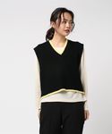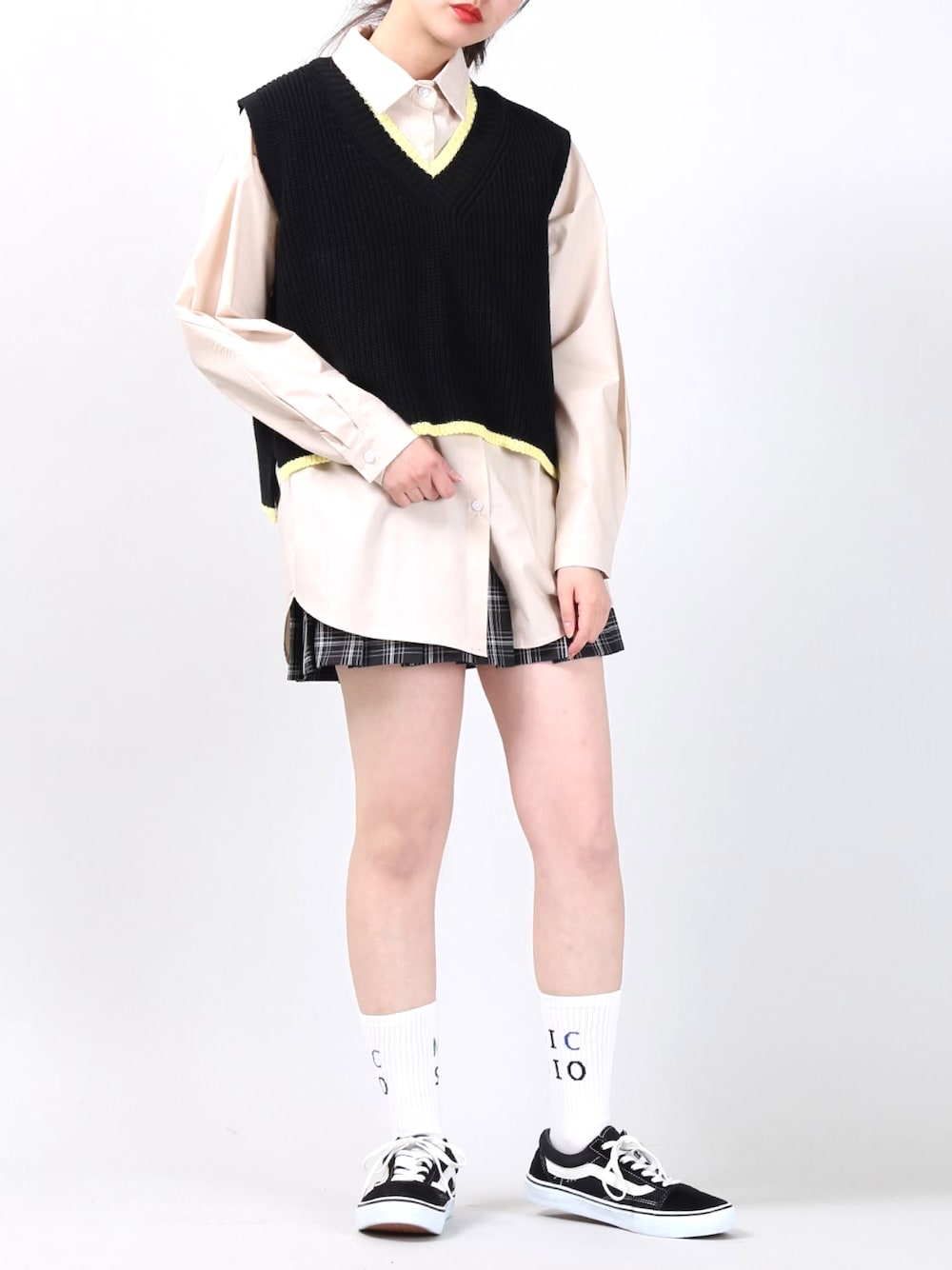 カラーラインニットベスト color:off white/grey/black size:free 無地カラーシャツ color:white/beige/pink size:free チェック柄プリーツスカパン color:black/brown size:free バックロゴソックス color:white/black size:free