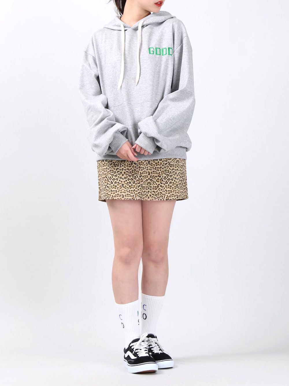 GOODロゴパーカー color:orange/blue/grey/black size:free ヒョウ柄ミニスカート color:beige size:free バックロゴソックス color:white/black size:free