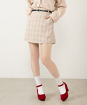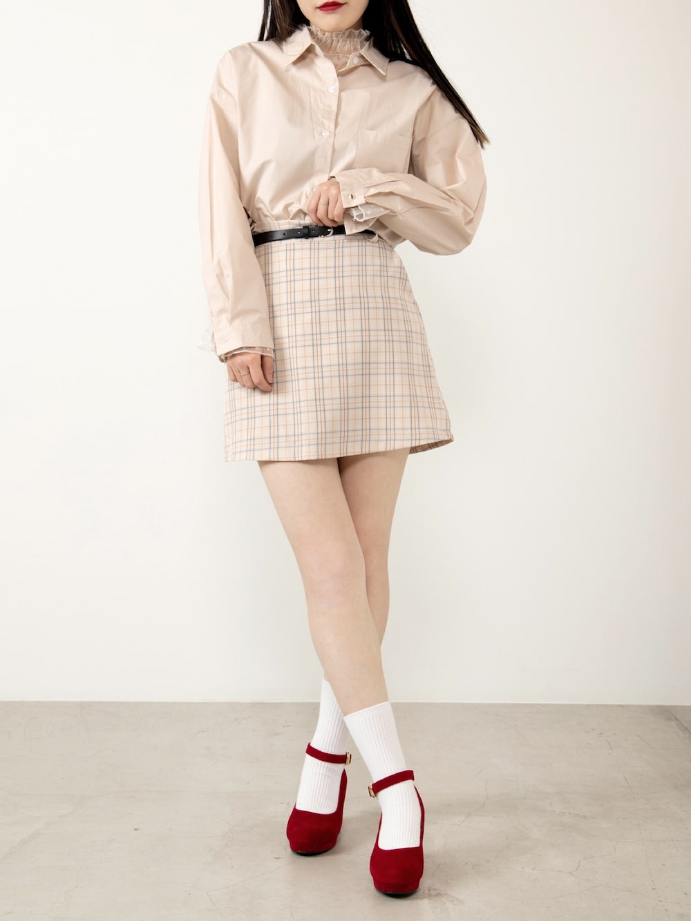 無地カラーシャツ color:white/beige/pink size:free ベルト付きチェックスカート color:beige/grey size:free