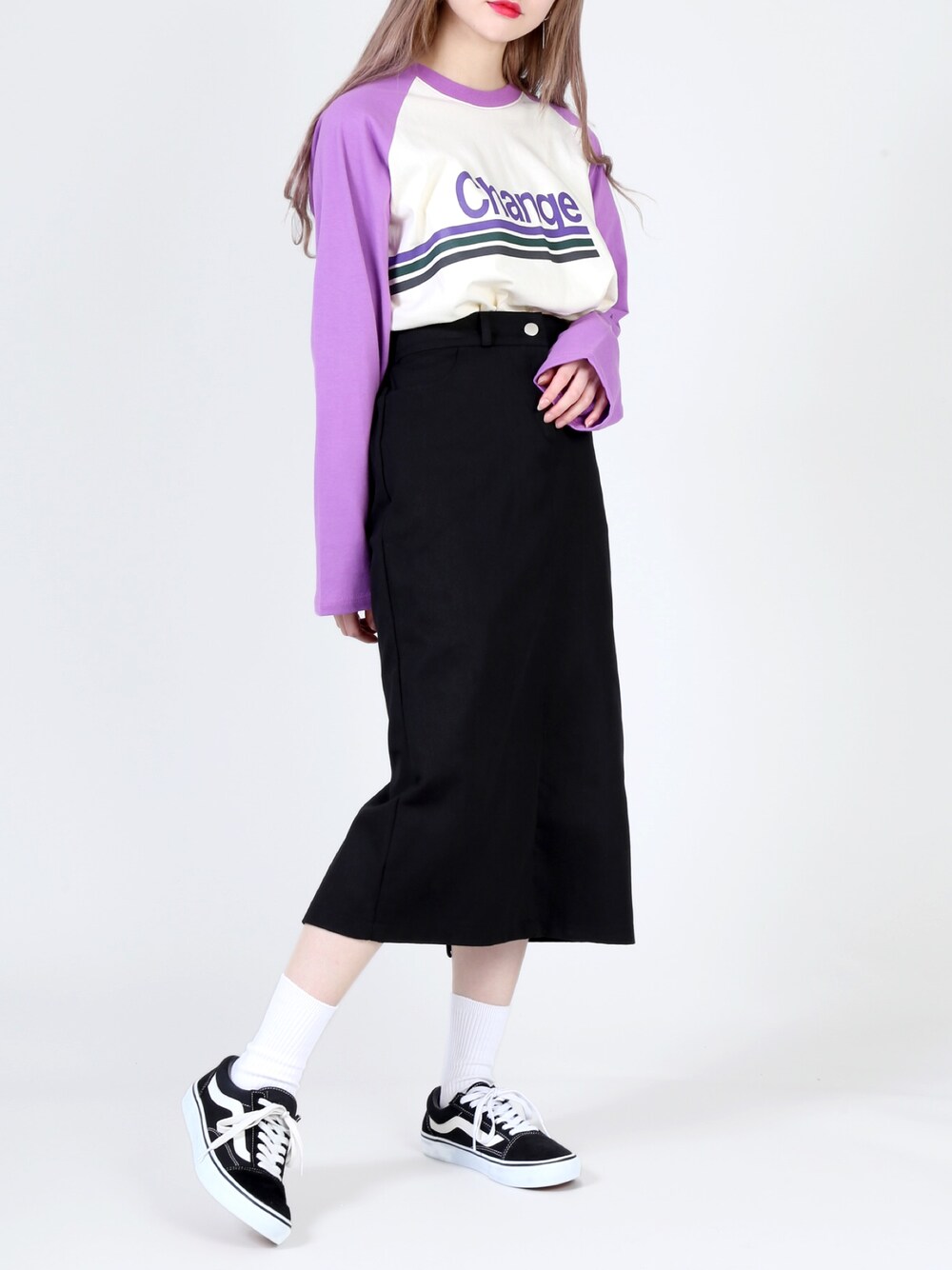 ChangeビッグラグランTシャツ color:lime/purple size:free ツイルロングスカート color:beige/black size:free