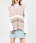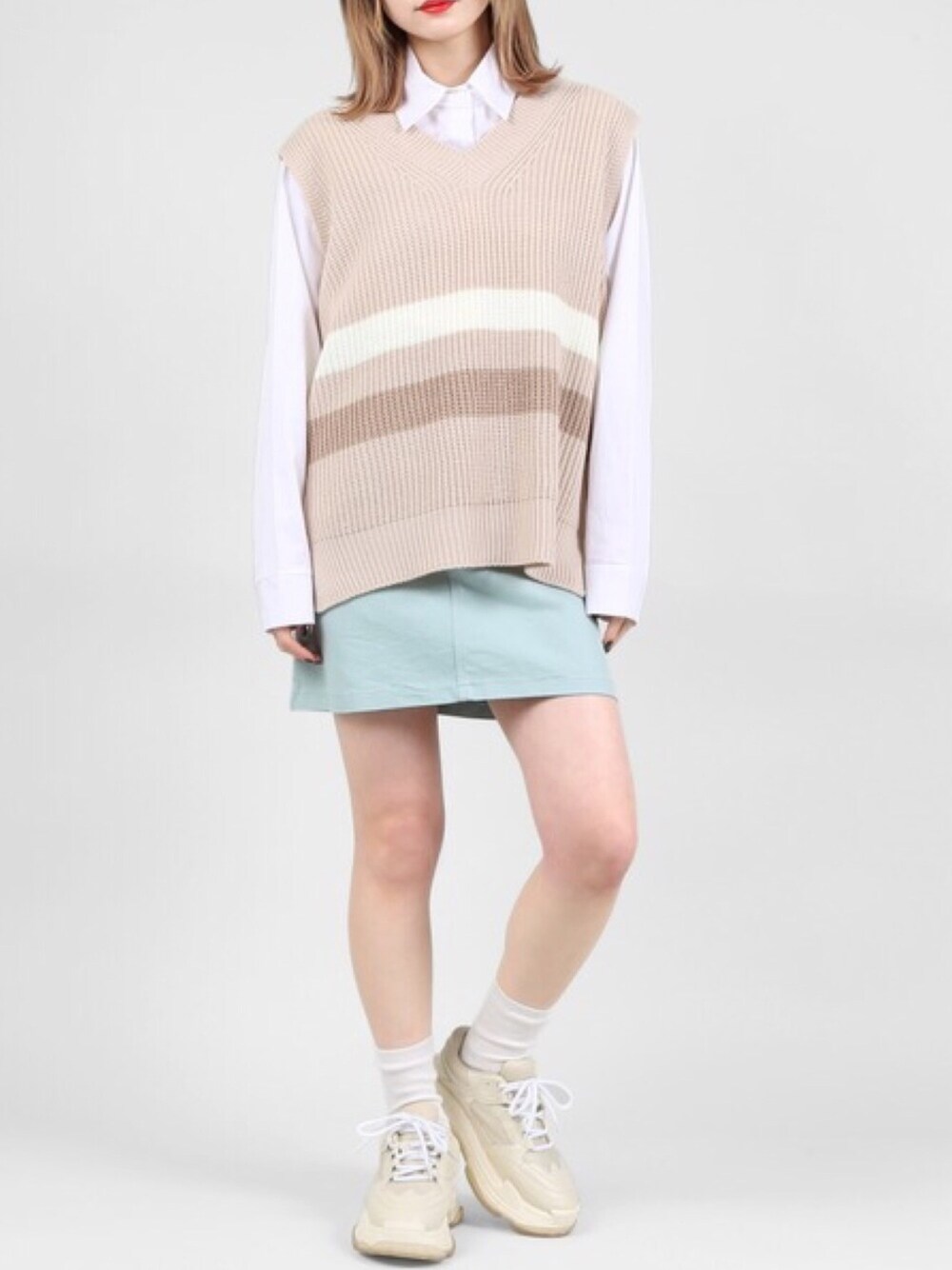 センターラインニットベスト color:beige/navy size:free 無地シャツ color:white/black/beige size:free 台形ミニスカート color:green/black/white size:free