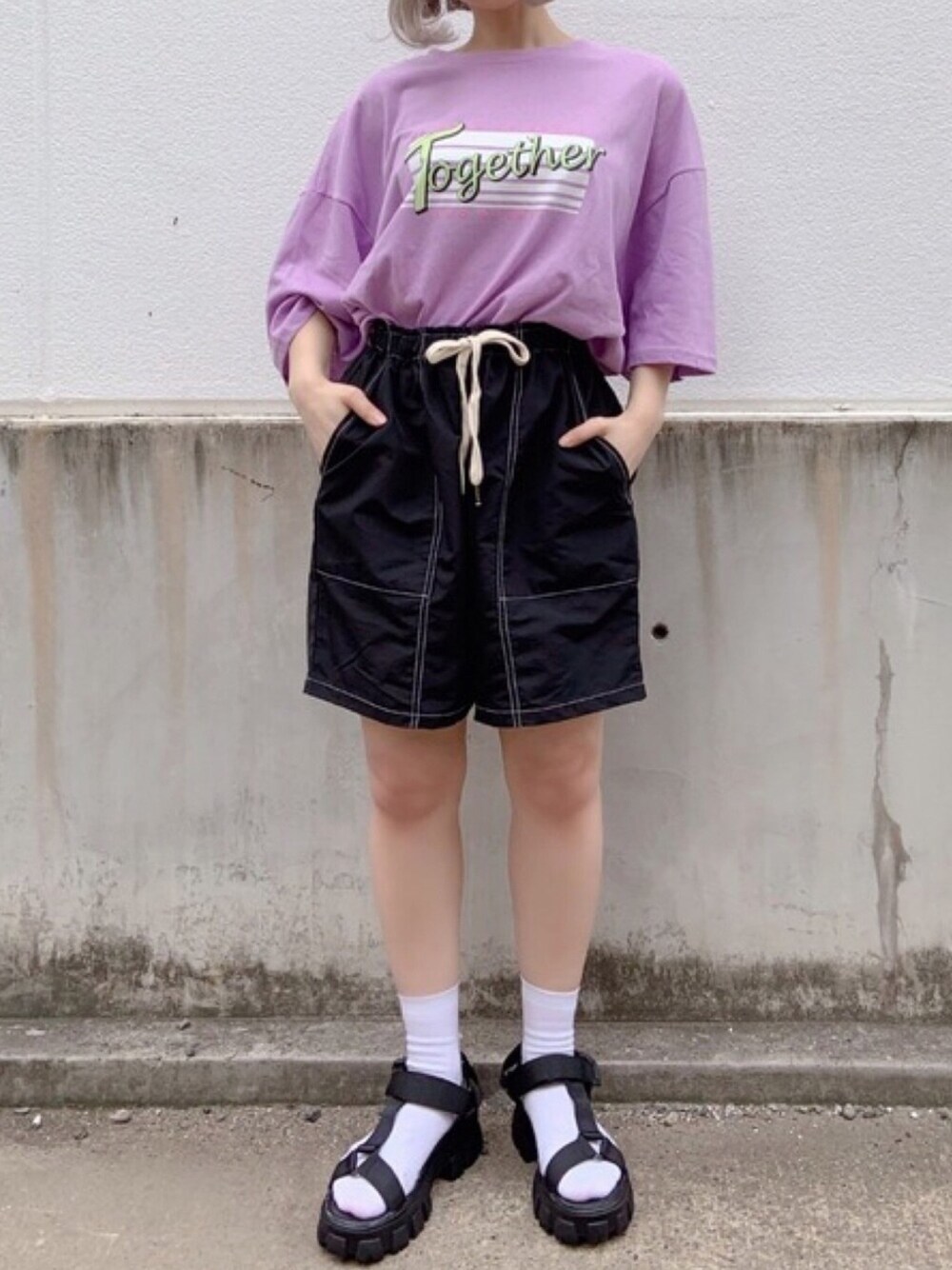 Together Tシャツ color:purple/white/charcoal size:free ステッチハーフパンツ color:black size:free